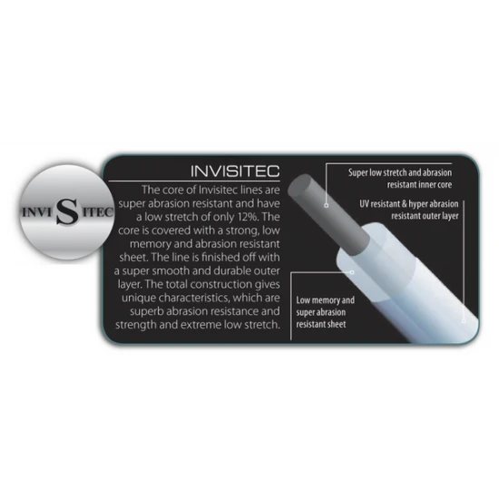 Die Shimano Technium Invisitec ist eine extrem abriebfeste Angelschnur und hat nur 12% Dehnung. Es ist eine Schnur mit einem starken inneren Kern, einer glatten transparenten Mittelschicht und einem abriebfesten und klaren UV-beständigen Außenmantel.